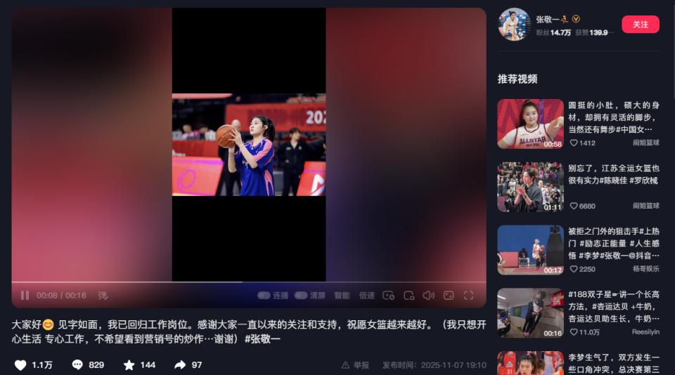 Ngày 9 tháng 11, "Nữ cà ri Trung Quốc" Zhang Jingyi thông báo trên mạng xã hội rằng cô đã chia tay WCBA và quay trở lại làm việc tại Đại học Sư phạm Bắc Kinh. Cô cũng cảm ơn mọi người đã luôn quan tâm và ủng hộ. Cô từng ném 16 quả ba điểm và ghi được 50 điểm trong một trận đấu ở WCBA.